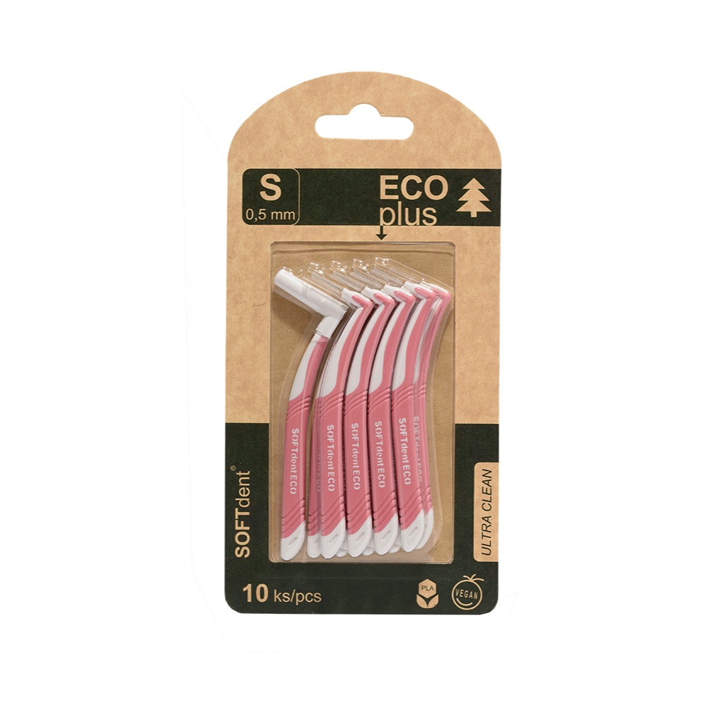 Zahnuté mezizubní kartáčky SOFTdent® jsou vyrobené z obnovitelných zdrojů, které šetří životní prostředí. Rukojeť mají z PLA plastů (Polylactic acid), jejichž základní surovinou je biomasa a přírodní materiály. Jsou určeny pro aktivní čištění mezizubních prostor, pomáhají jako prevence před vznikem zubního kazu a paradontózy. Díky své konstrukci do tvaru L účinně čistí a odstraňují zbytky jídla a plak i z těžko dostupných míst mezizubních prostor. Součástí balení je praktický kryt vyrobený ze škrobu.