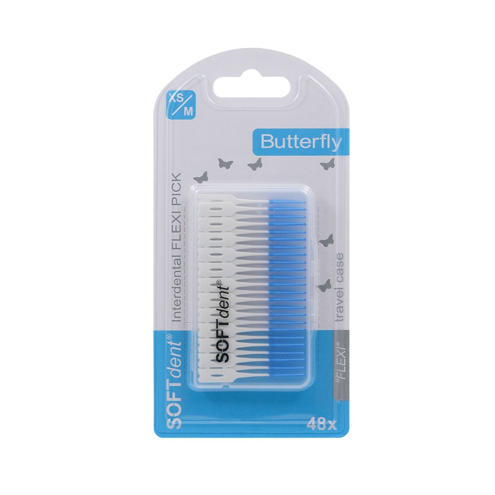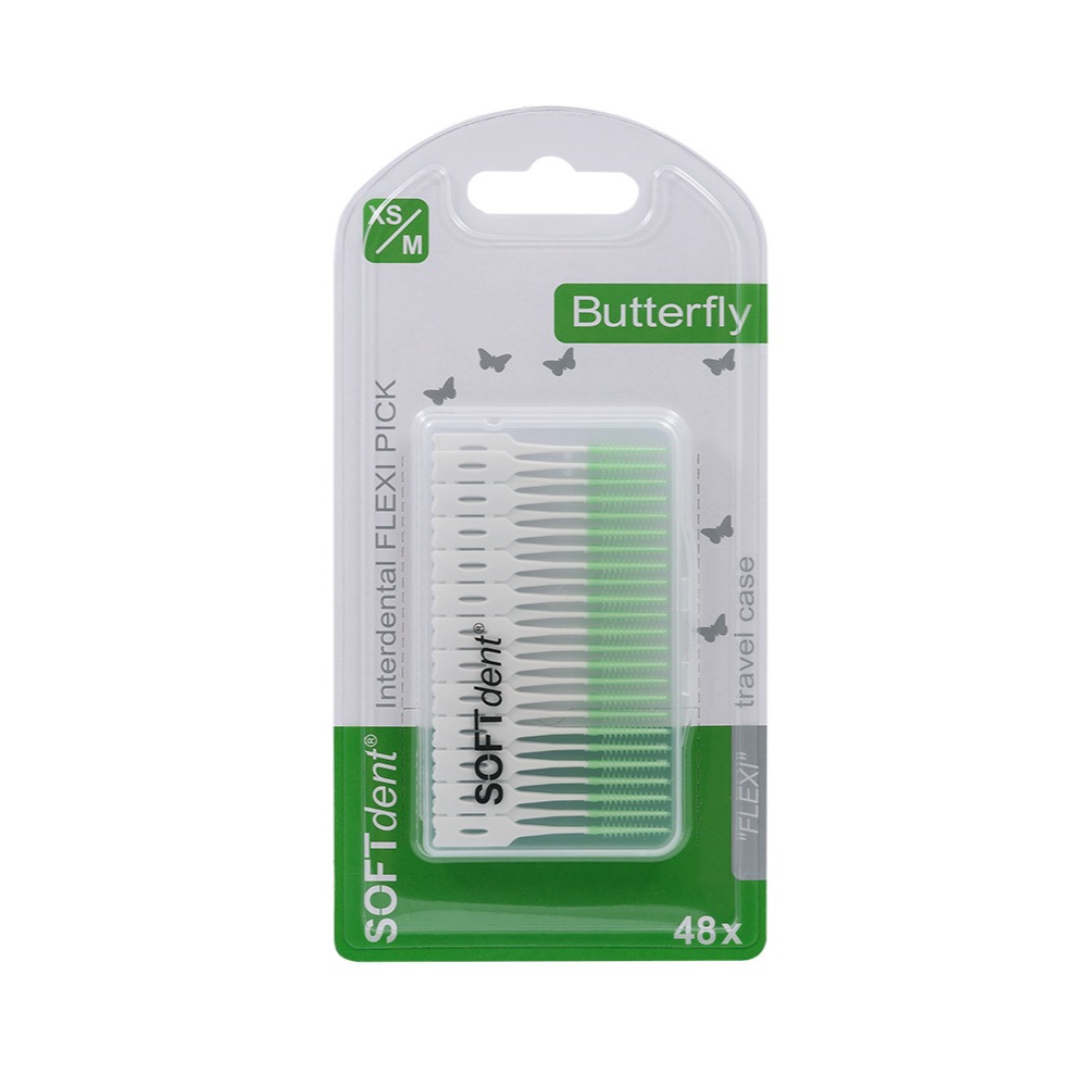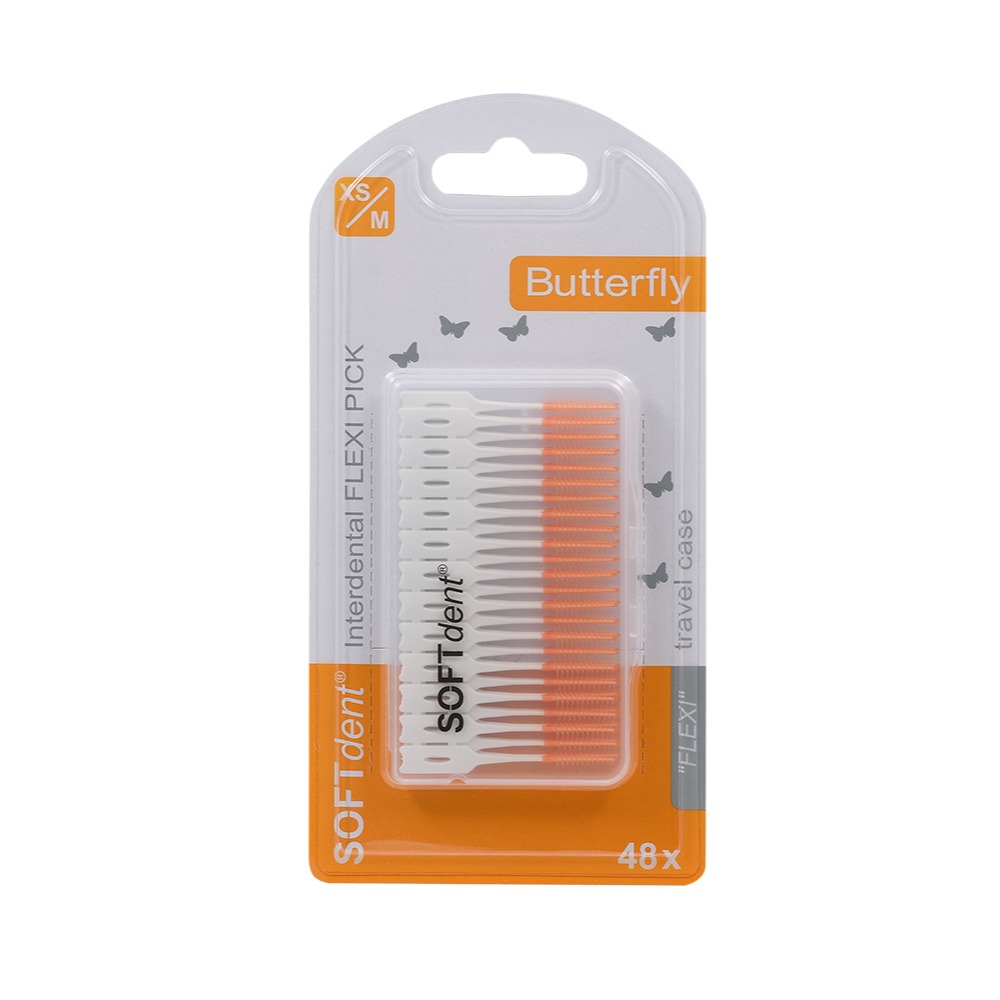 Jednorázová dentální párátka s kartáčkem z flexibilního materiálu SOFdent® Butterfly FLEXI PICK jsou vhodná pro čištění všech velikostí mezizubních prostor. Jemně masírují dásně a jsou díky praktickému uzavíratelnému boxu dokonalým společníkem do kanceláře či na cesty.