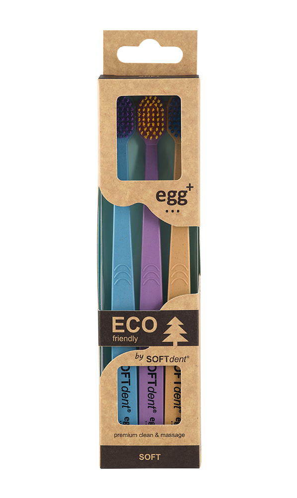 Zubní kartáček SOFTdent® EGG+ je nejkomplexnějším řešením péče o citlivé zuby a dásně. Unikátní tvar hlavy v kombinaci s ergonomickou rukojetí vytváří systém CLEAN & MASSAGE, který spojuje efektivní čištění se šetrnou masáží dásní. Jemná kónická vlákna s úzkými konci snižují tlak při čištění, umožňují lepší přístup k citlivým oblastem a pečují i o oslabené okraje dásní. Kartáček je vybaven čističem jazyka pro kompletní ústní hygienu. Rukojeť vyrobená z bambusu a recyklátu přispívá ke snížení spotřeby plastů při výrobě.